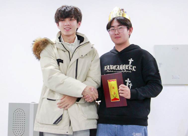 在傳承環節上,上屆漢字錄入比賽冠軍,24級電氣自動化專業班的姚俊成同學為本屆冠軍侯旺延同學佩戴冠軍桂冠,慶祝同學奪冠,兩位冠軍愉快的合影留念。姚俊成寄語全體同學,希望在今后的學習中取得更好的成績。