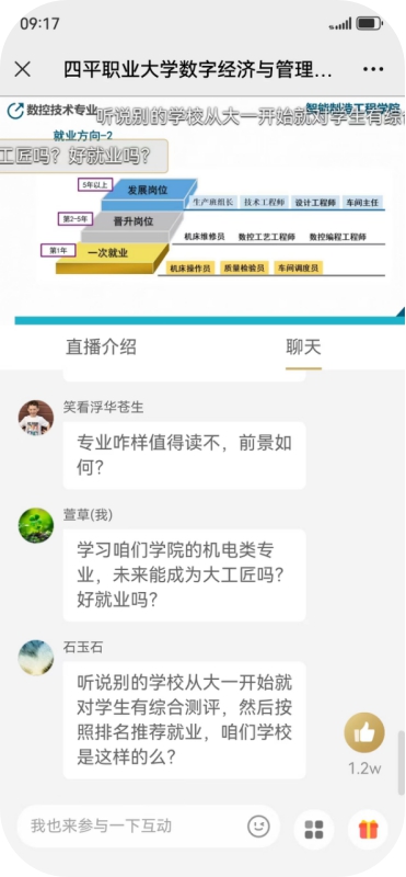 吉林大學誠可貴,清華北大分更高。若想學習好專業,四平職大任你挑! 4月11日,為了擴大學校的影響力,回復考生和家長的關注及疑問,以職教園區建設發展為契機,四平職業大學利用“中國教育在線”、“掌上高考”等咨詢平臺,進行招生直播宣傳活動。